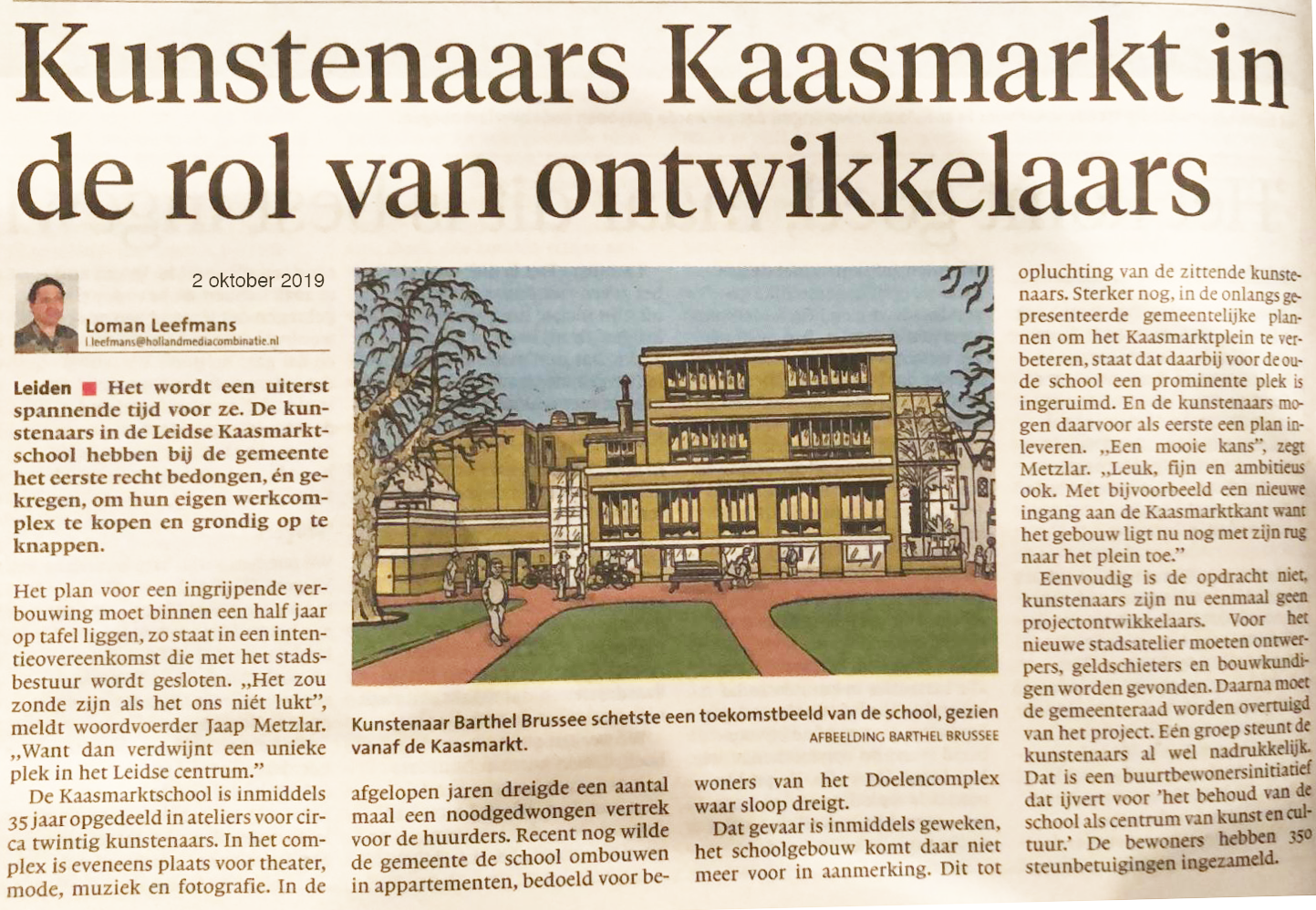 Het Leidse bedrijf Streetlife BV heeft een winnend projectplan ingediend en bod gedaan voor het ontwikkelen van de monumentale Kaasmarktschool tot een gerenoveerde en uitgebreide broedplaats voor kunst en cultuur met woon- en werkateliers. De Kaasmarktschool is het voormalige schoolgebouw uit 1909 van de Protestants Christelijke Schoolvereniging in Leiden aan de Kaasmarkt. Dit prachtige gebouw is sinds 1985 een verzamelgebouw voor kunstenaars. En sinds 2014 een gemeentelijk monument.